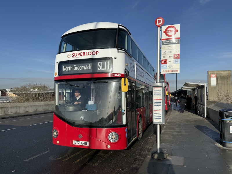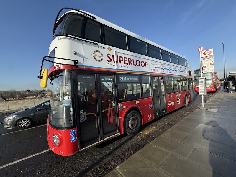 The SL11 hasn’t got off to a very promising start with only a handful of buses in the new high profile Superloop SL11 branding. When I took a ride yesterday morning just three New Routemasters were out in service with the other 14 buses registering on the tracking being a ragbag of life expired 16 year old Wright Eclipse Gemini bodied Volvo B9TLs which have completed their innings on TfL work and must be ready for downgrading to school work somewhere or even a new life in Cornwall.