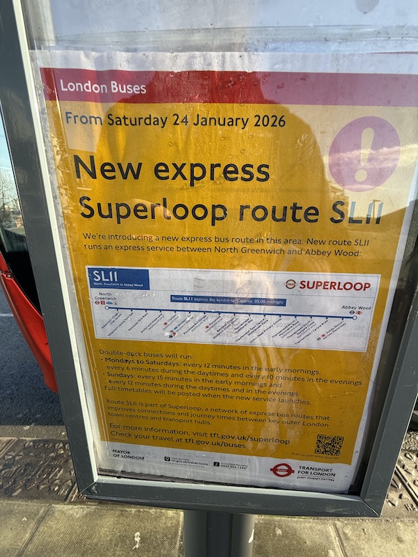Last weekend saw the eleventh (ignoring Bakerloop) Superloop branded route introduced by TfL. The new Go-Ahead London operated SL11 between North Greenwich and Abbey Wood has merely replaced the now withdrawn route 472 between the same locations with the added feature of it being ‘express’ or more accurately ‘limited stop’ with 25 of the former intermediate stops on the 472 now abandoned leaving just 16 served by the SL11 and a more direct routing through Woolwich town centre.