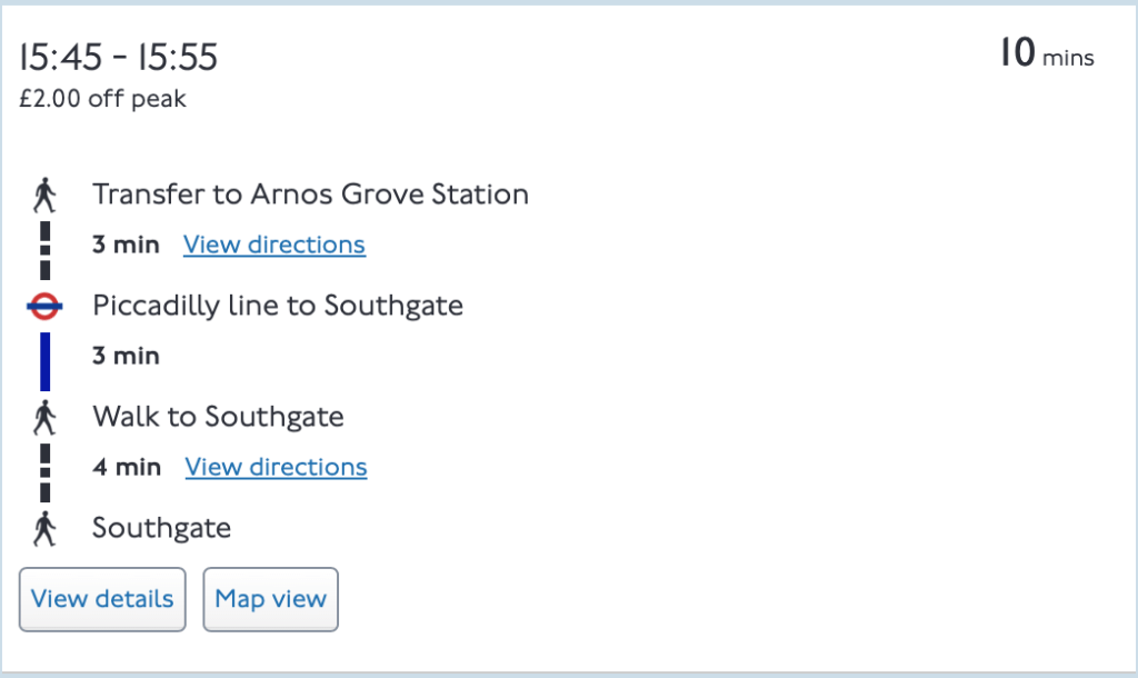 … but in the other direction, the two favoured options were to take a 19 minute walk from Southgate to Arlington Road where you’d catch a bus on route 184 for a one minute bus journey to Arnos Grove.