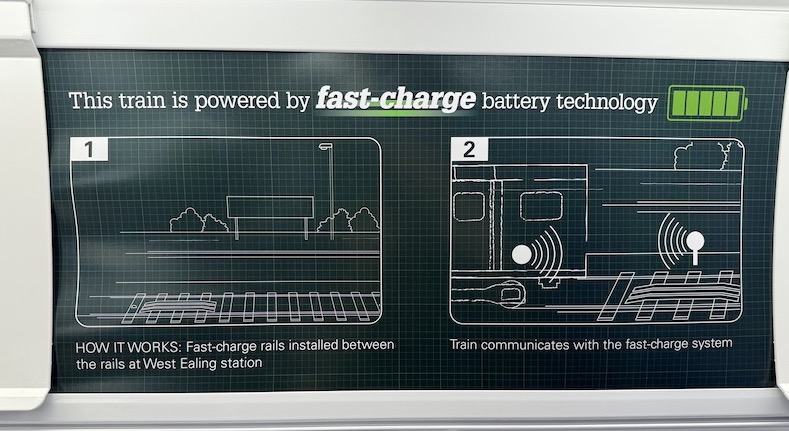 Every time the train arrives at West Ealing the shoes attached to the batteries under the train line up exactly with two strategically positioned fast charging rails in the centre of the track.
