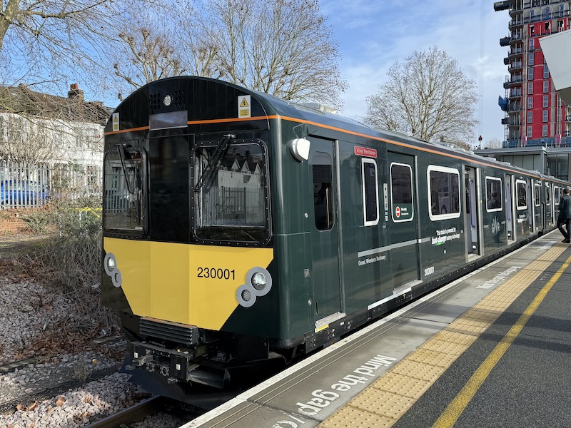 The more modern of the pair is Chiltern Railways’ loco hauled Mark 5A coaches formerly with TransPennine Express where they saw very little service (if any at all, in some cases) since new in 2019, being withdrawn in 2023, while the more ‘mature’ of the pair is GWR’s former London Underground D78 Stock now reclassified and rebuilt as Class 230 and uniquely this example being battery powered with fast charging capability.