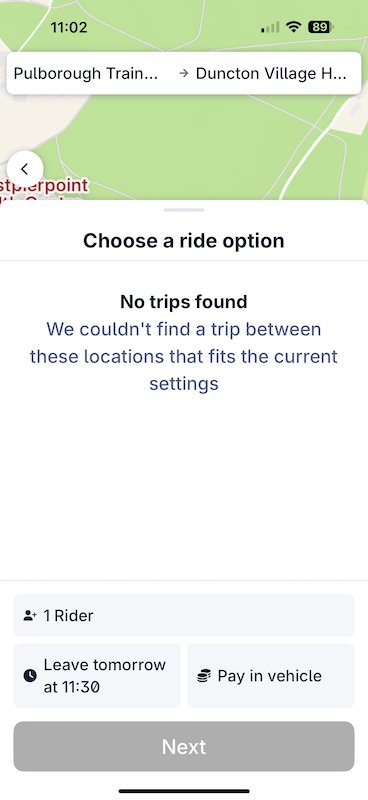 The app wouldn’t let me book it – stating erroneously “we couldn’t find a trip between these locations that fits the current settings” when I tried to book on the Tuesday before travel. Instead I booked by phone and was given a window of 11:20 to 11:50 and was reassured there’d be a note added for the driver to advise ‘passenger arriving by train due at 11:22’.