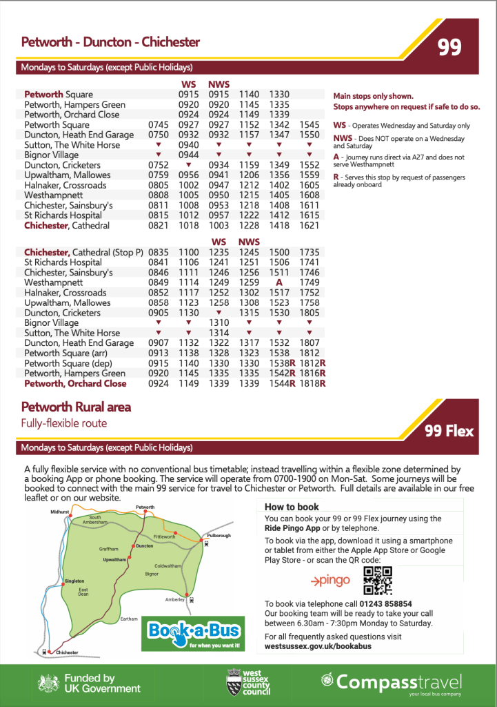 So, although the main timetable has reduced somewhat, those hamlets now have a shopping service to Chichester, albeit just one journey, but, in addition, they do have the benefit of the Book-A-Bus 99 Flex and can try and book a journey to Petworth at any time to suit their needs. I doubt many do.