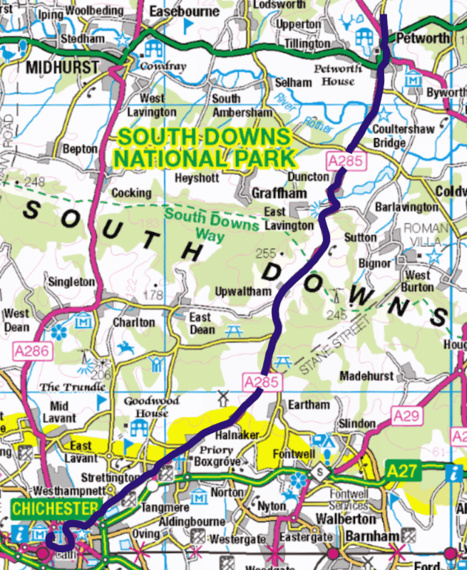 However on a Wednesday and Saturday as a nod to the old arrangements one southbound trip from Petworth and one northbound return journey from Chichester regularly diverts away from Duncton on the A285 to serve Sutton and Bignor.