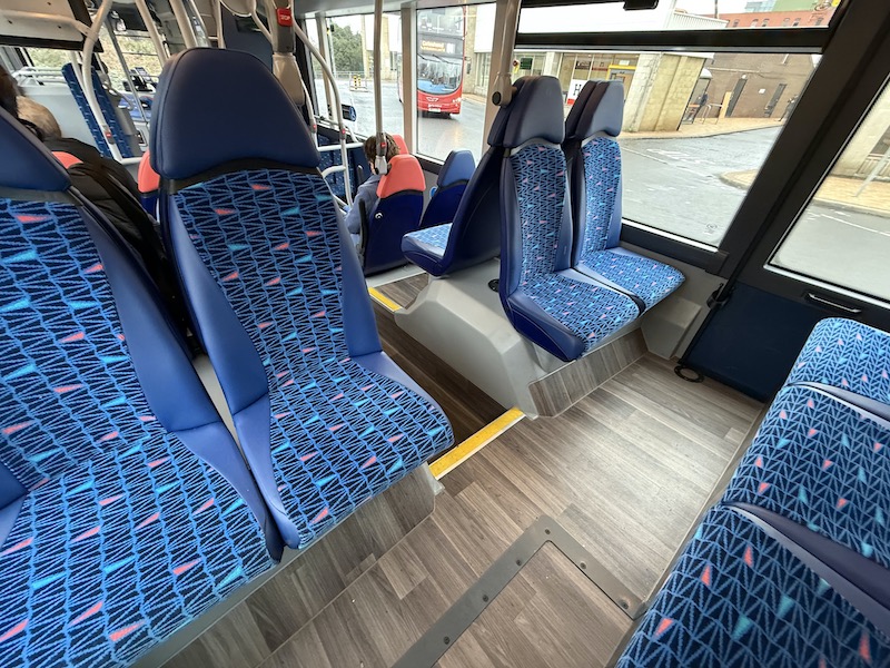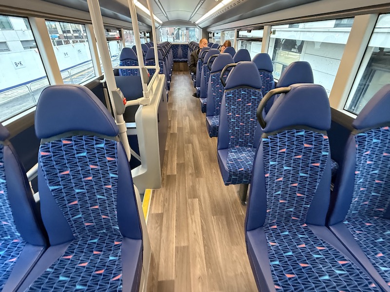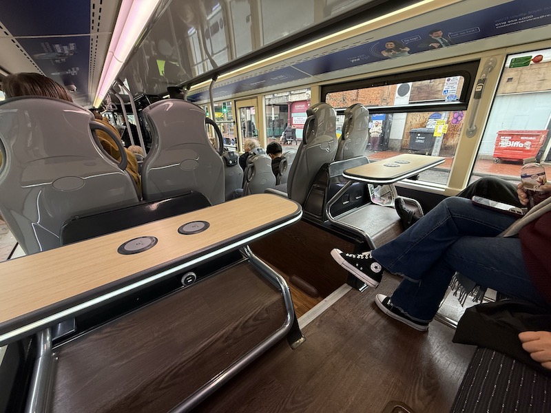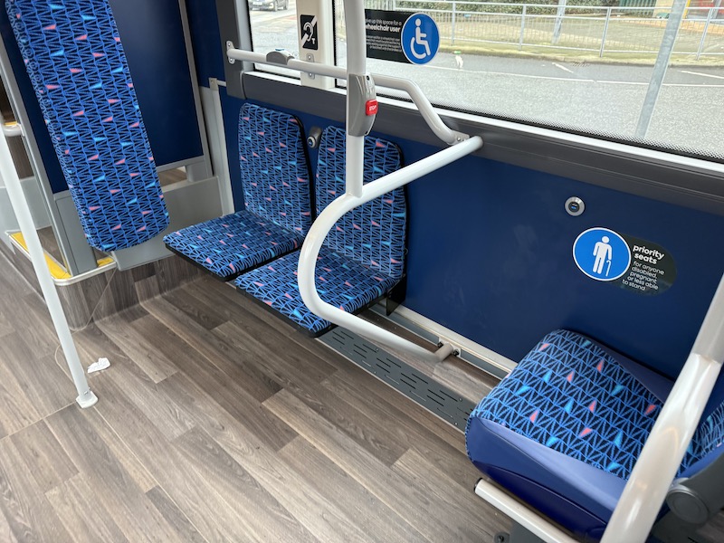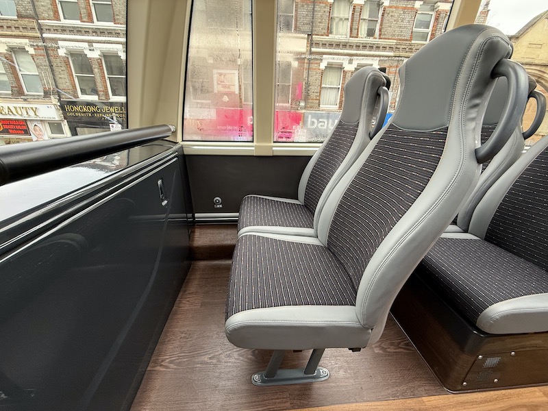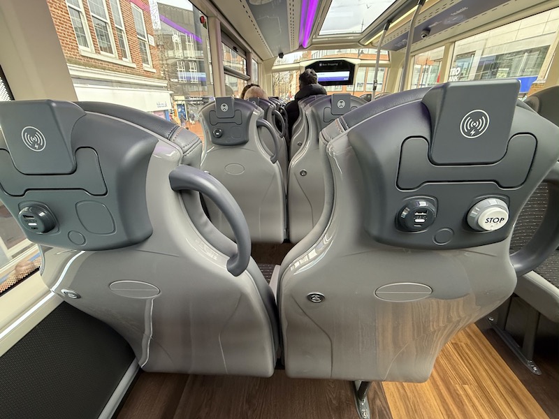 The seats themselves are comfortable, as is the leg room, but I prefer Reading’s more subtle grey based moquette. Also, there are no wireless charging holders on the rears of the seat backs but there are usb and bell pushes.