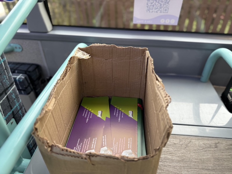 The driver was absolutely excellent, very helpful and polite to everyone handing out timetable leaflets from beside his ticket machine and I also noticed a box containing a good supply above the front nearside wheel which another passenger helped himself to before announcing he’d been distributing them locally to ensure all his neighbours and friends “are aware of this great new service”.