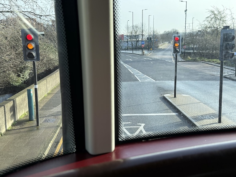 At the bus stop for Plumstead bus garage there’s a short stretch of bus only road with traffic lights enabling buses heading due east to cut across the two lanes of traffic and through another ‘bus only’ slip road as can be seen in the above photo, but frustratingly, as the bus enters the latter, the traffic signals that had been on green, turn to red as can be seen in the below photo, and the bus has to wait for turning traffic to pass across. Which all seemed a bit counter productive for bus priority.