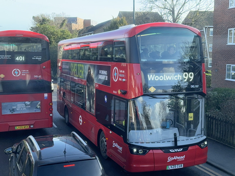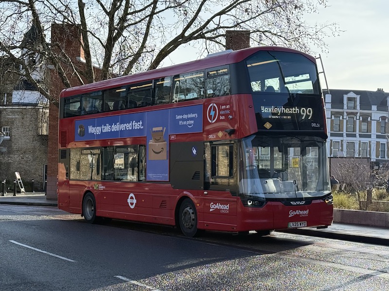 Route 99 is operated out of Go-Ahead’s long standing former London Transport bus garage in Bexleyheath and has 14 buses allocated to provide the route length of 10 miles with a 13 minute frequency (15 minutes at the weekends). The Electroliner buses are a recent introduction to the service and have higher backed seats as is becoming standard in London these days…