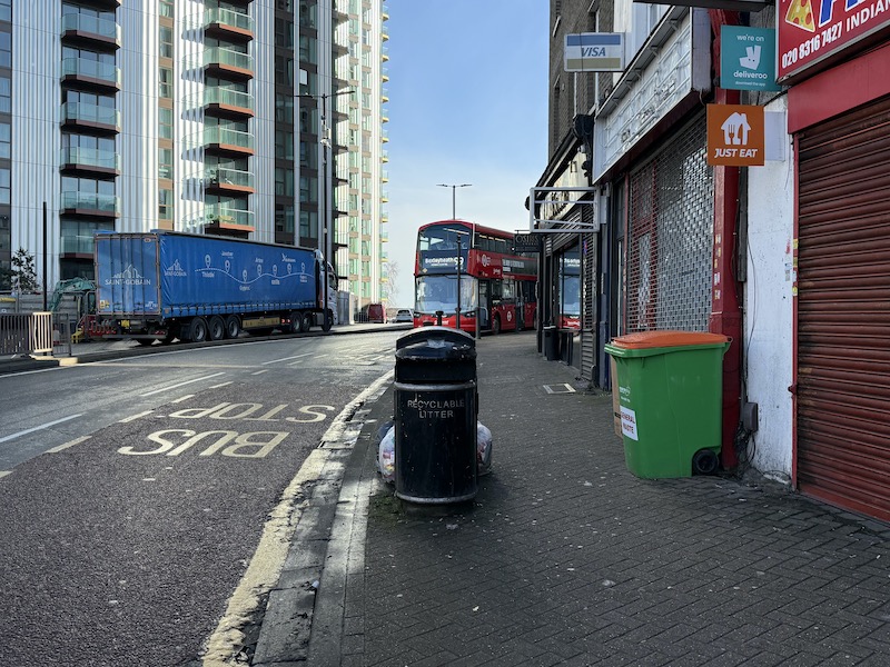 But, let’s begin at the western end of the route at the terminus in Woolwich, which as you can see is in the shadows of the towns relatively recently built tower blocks of flats in the High Street, albeit the retail offer at that location is not what one might expect from a traditional High Street.
