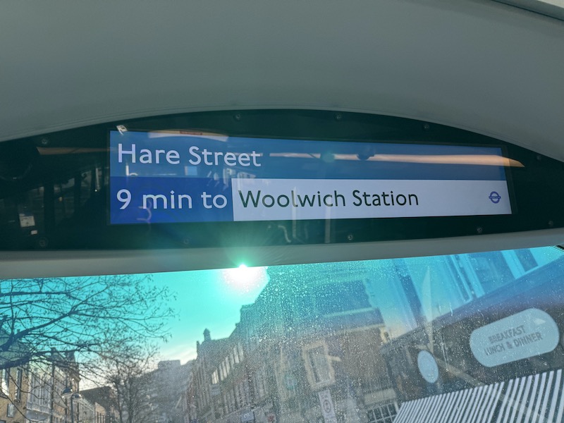 … and much improved information displays including predictive journey times, which as you can see a convoluted routing around Woolwich town centre gives a nine minute journey time to reach one of the town’s many stations (this one called simply Woolwich being on the Elizabeth line). It would take less than that to walk it along High Street.