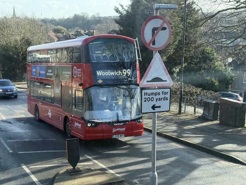 There are many other bus routes which head eastwards from Woolwich towards neighbouring Plumstead. I counted 10 besides the 99 and passengers enjoy a bus a minute (62 buses per hour).