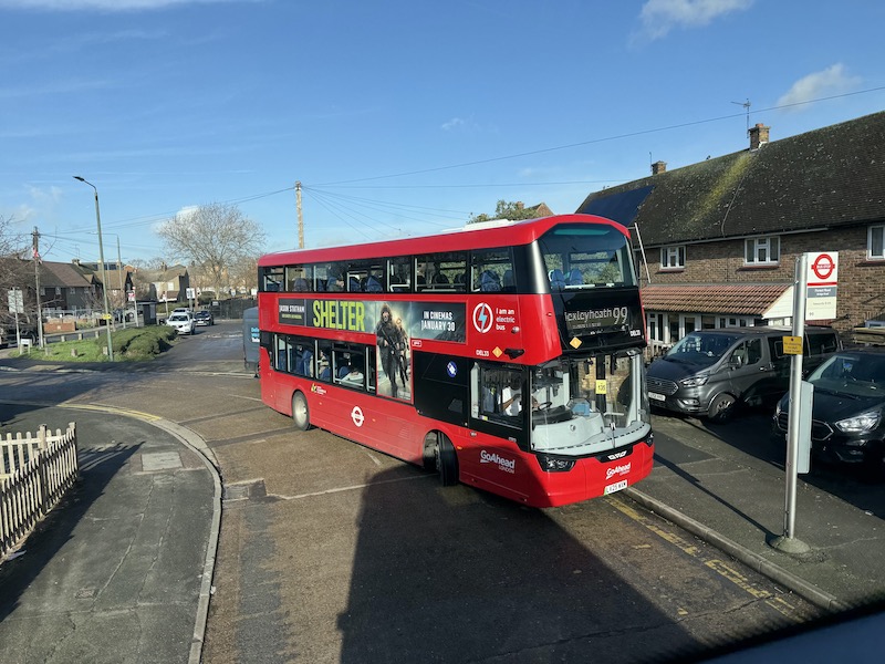 Buses on the three routes take advantage of a short bus stand layby just east of the bus stop and I patiently waited for the smart new Go-Ahead London Wright StreetDeck Electroliner with 99 Bexleyheath screened up to power up and glide the few yards down to the bus stop and pick me up.