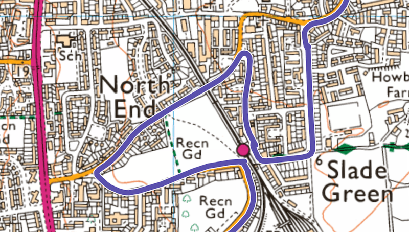 … where for a brief distance we’re joined by route 469 as well as route 401 which crosses our path on its way from Bexleyheath to Thamesmead. No-one from here would catch a 99 to Bexleyheath since the 401 would take you directly there in 10 minutes whereas our route via Erith and Slade Green will take 36 minutes.