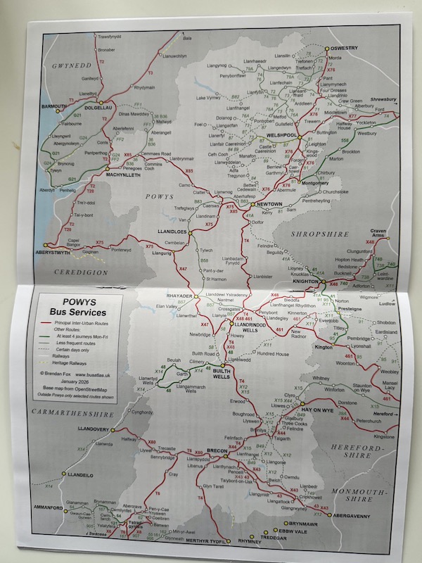 The map is a masterclass from Brendan Fox who runs the hugely helpful busatlas.uk website and is to be congratulated and heartily thanked for giving permission for his cartography skills to be included in the book. It’s so much easier to follow than what is now on the Powys website as featured in last month’s Seen Around.