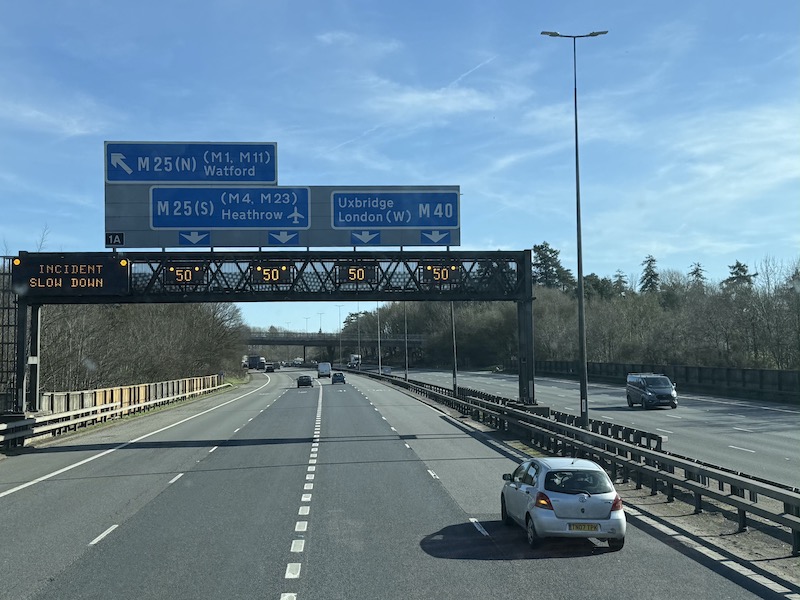 On my return journey from High Wycombe to Uxbridge on an M40 on the M40 the overhead gantry signs were ominously advising of an “Incident” ahead with a reduced 50 mph limit…
