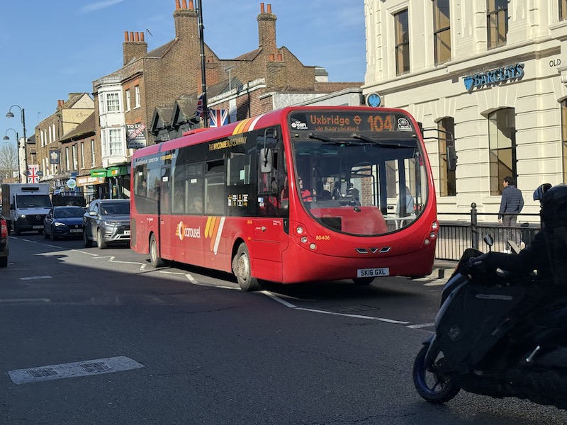 Leaving High Wycombe buses pick up at bus stops along the A40 until Loudwater where they join the M40 at Junction 3 through to New Denham at Junction 1 from where it’s a short hop through New Denham into Uxbridge setting down in Belmont Road for the shops and Underground station.