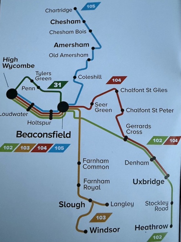 First Bus has operationally linked the two routes in High Wycombe so Slough based drivers can be efficiently scheduled on to the M40. It looks as though nine buses are needed to run the combined two routes whereas I believe route X74 between High Wycombe and Slough used to take four buses. So, an increase of five buses is quite a commitment especially as at least two of the additional buses are competing with itself – ie route 3 between Slough and Uxbridge, as well as Carousel’s 458, and between Loudwater and High Wycombe with the X74 (as well as Carousel’s 102/103/104/105)