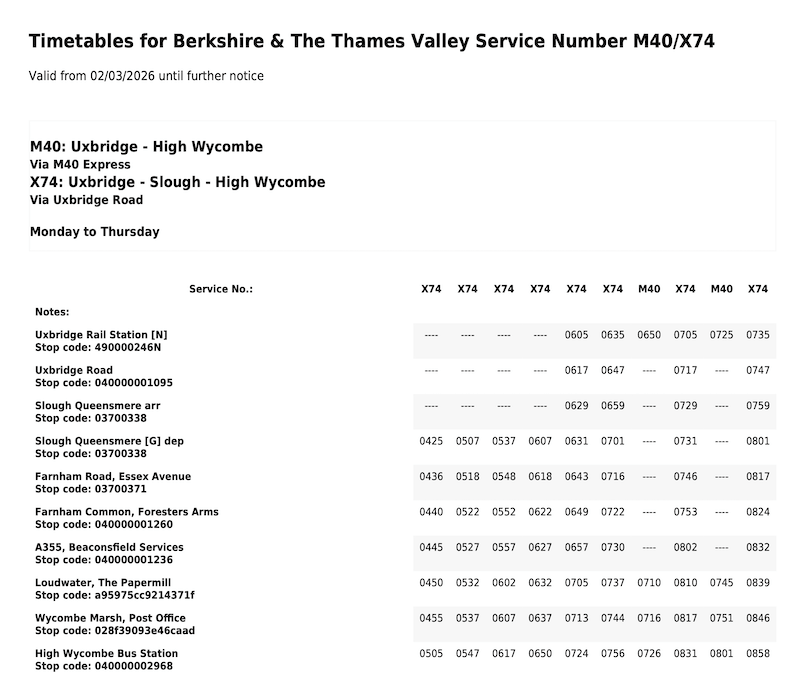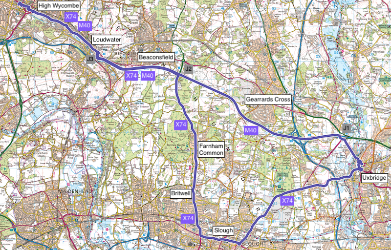 The first runs direct between Uxbridge and High Wycombe via the M40 and is itself appropriately numbered M40 while the second is an extension to the already fast X74 between High Wycombe and Slough which now continues to Uxbridge.