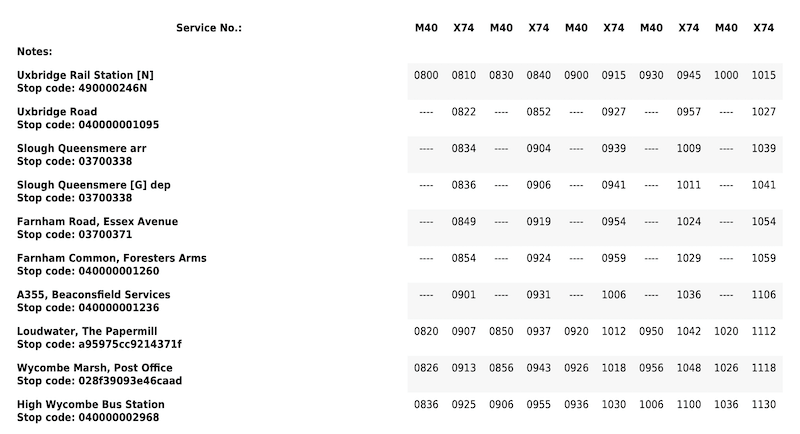 It’s not exactly an enticing presentation to attract new passengers and although the section of route between High Wycombe and Loudwater is common to both routes – presumably leading to the decision to combine both routes into a presentation in one combined timetable layout – as you can see, most of the route/s is/are separate and appealing to different markets. The X74 shows very few timing points for the length of route and note also journeys on the bottom half of the layout between Loudwater and High Wycombe are consequently not in time order due to the differential journey times, making for a non sensical presentation.