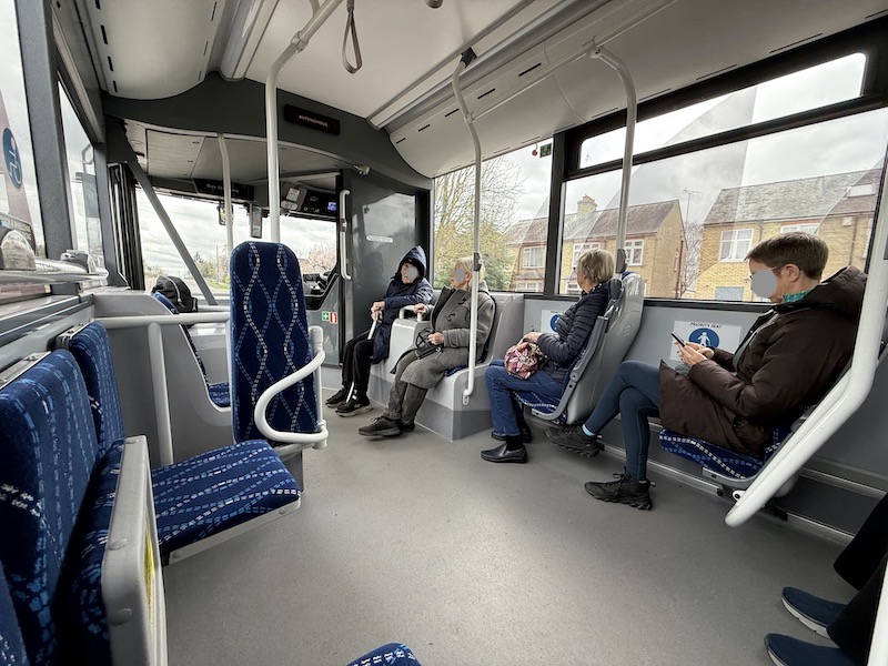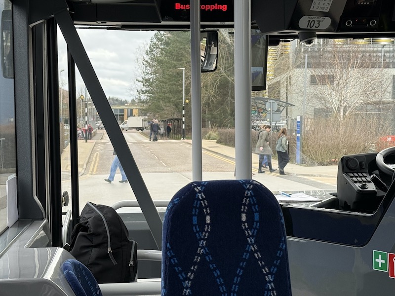 We didn’t carry any passengers on that first round trip but on the 11:00 departure from Trumpington, Sam pulled up to the departure stand, also used by Stagecoach’s guided bus route A to the Cambridge Biomedical Campus (before continuing to the city centre and St Ives), where there was a queue of eight passengers waiting to get to Addenbrooke’s so they all came aboard, intrigued at the idea of travelling on a self-driving bus.