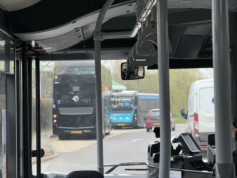 I’m told by Central Connect staff, who were also out in force yesterday morning, including managing director Peter Nathanail, that First experienced two more buses breaking down during the morning resulting in more busy Central Connect buses and making for an ominous start to the new contract. First’s buses being used are former ADL Envro400s bought back in 2018 to revitalise Cornwall’s bus network and we know how that ended. They’ve now been repainted in the black livery specified by Essex County Council for its Park & Ride routes.