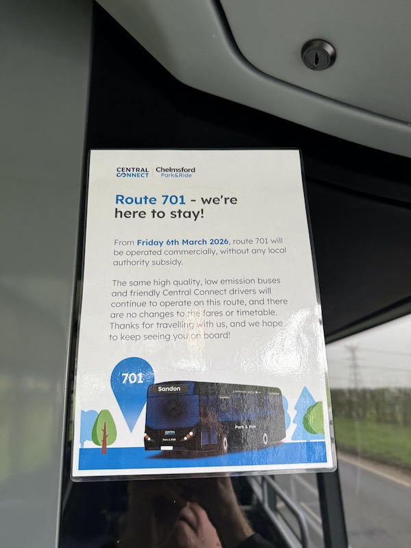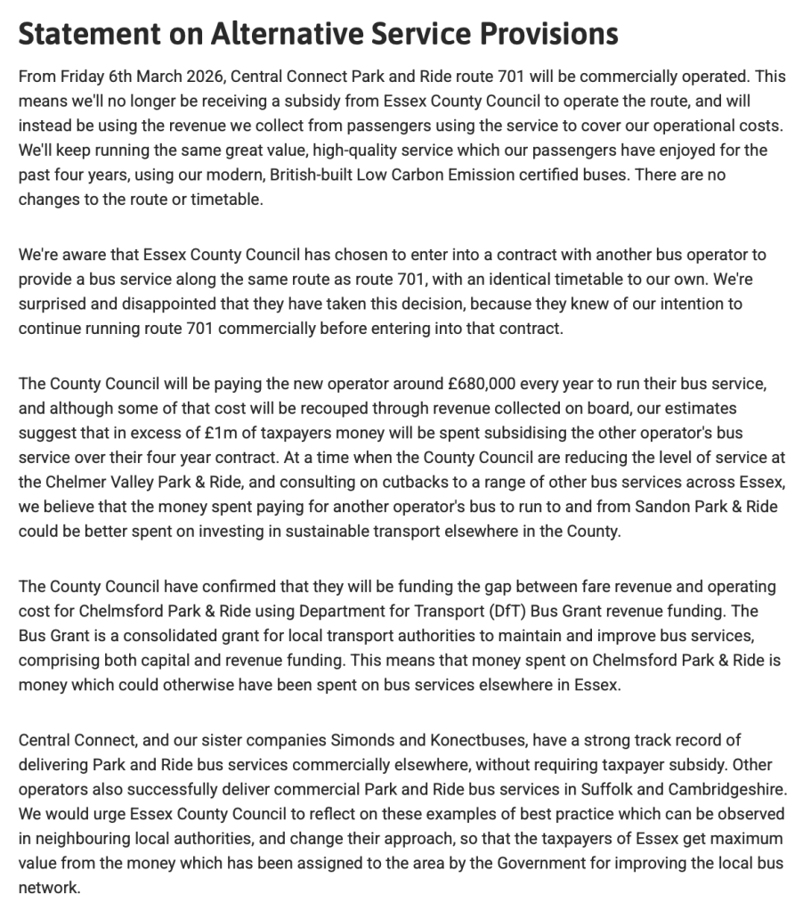 You’d think Essex County Council would welcome them with open arms. Yes, I know it would have been better had Central Connect advised the Council before it sought tenders that it would run the 701 commercially, but the fact it did so before the contract was awarded to First Bus, indicates the Councils line of thinking and it would probably therefore have still gone ahead and invited tenders.