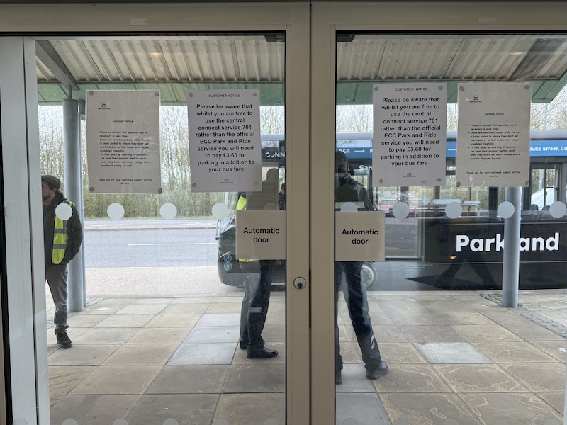 Central Connect proclaiming “we’re here to stay” is highly commendable, but that statement was issued prior to yesterday’s shenanigans when the County Council effectively as good as blocked passengers from using its buses. Yes, I know the notice says “you are free to use the central connect service 701” but, with the door to the bus stop effectively out of action – you have to manually force it open with two hands unless the Council staff member pushes a button – intending passengers are not really being given a free choice. And, the £3.60 extra charge is an outrageous tactic for a local authority to use against a bus company doing its best to provide a quality service for passengers.