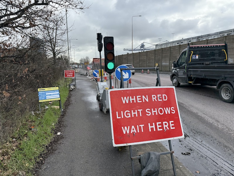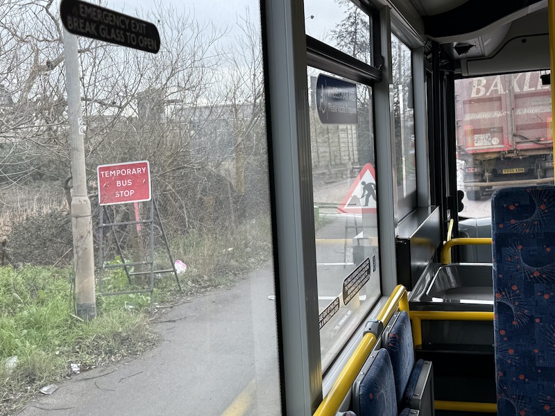 Two of our three passengers alighted at Asda and after our 10 minute stand time we set off towards the Ferry Terminal and as we sped along St Andrew’s Road approaching the roadworks I noticed a Temporary Bus Stop sign annoyingly placed just beyond the extent that I’d walked seeking the bus stop out. From the reverse I just thought it was just another roadworks sign.