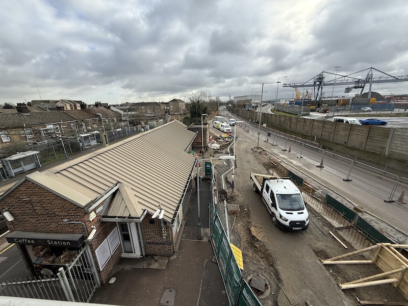 I decided to give up and make my way back via the footbridge to the north side of the station by the eastbound platform and catch the bus there after it had been to the closed down ferry, and sure enough while on the footbridge I saw the bus I’d hoped to catch speed by through the roadworks without stopping – by the very station that is the whole reason the bus exists to serve.