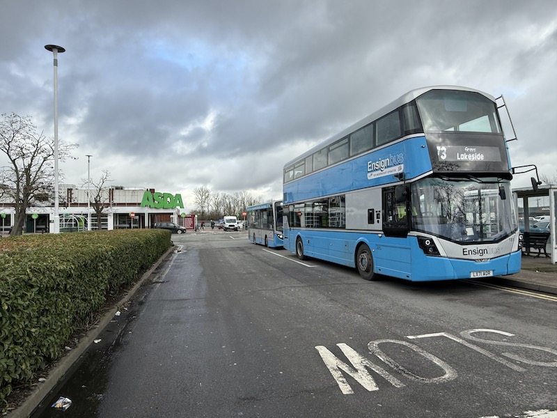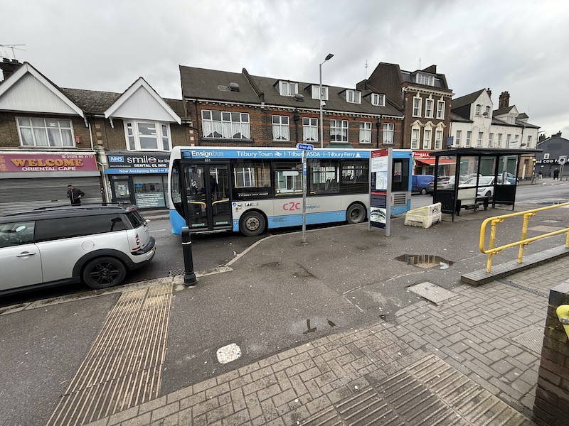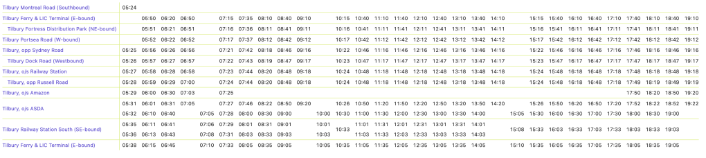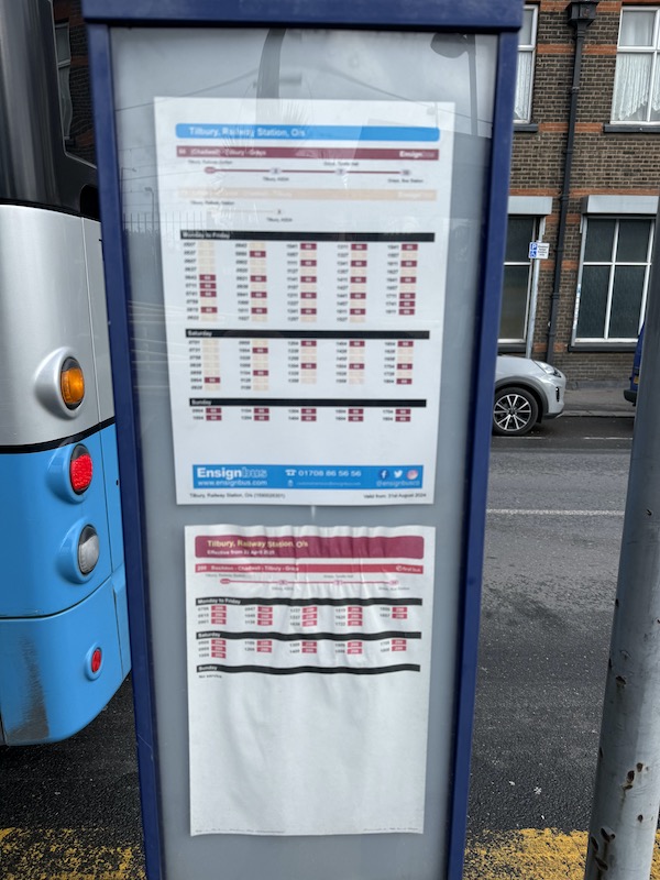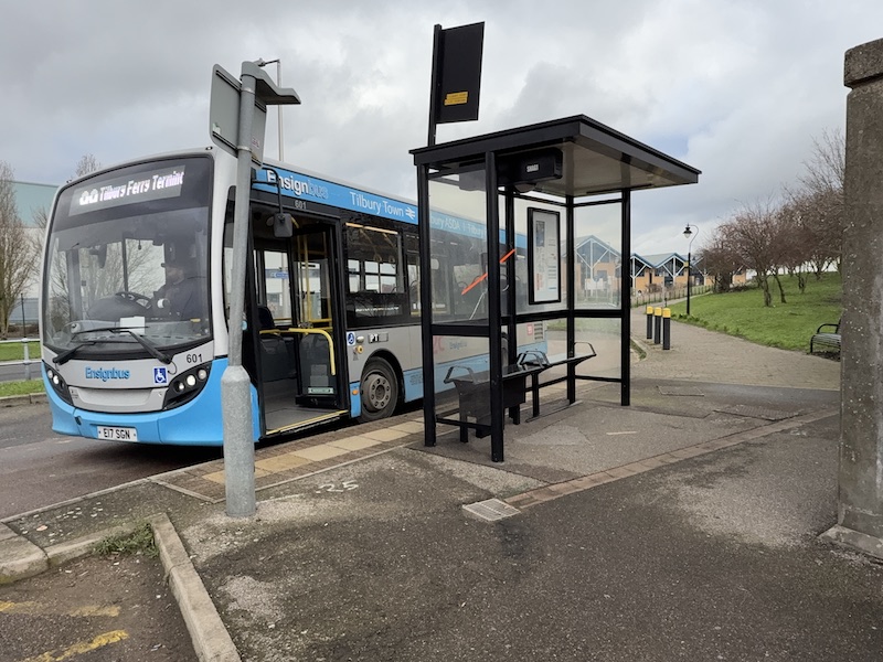 I say “relatively recent” as last time I travelled on the route a few years ago the bus definitely went via Civic Square, and just to confuse potential passengers using the Ensignbus website to access the timetable, as you can see below, it’s still showing a timing point at Tilbury Civic Square at 14 and 44 minutes past the hour.