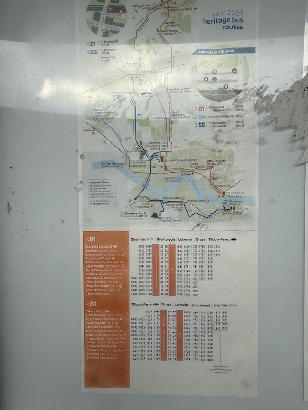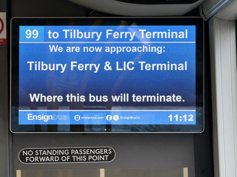 … noting the internal display confirmed the bus will terminate at the withdrawn Tilbury Ferry and LIC Terminal (which Google tells me stands for London International Cruise Terminal).