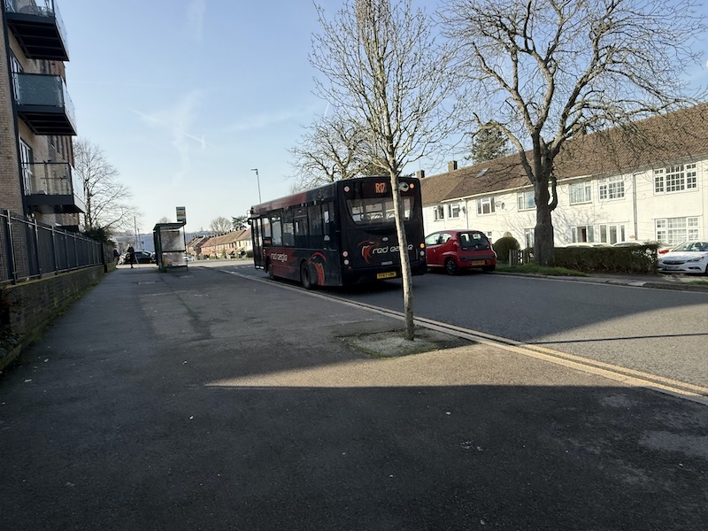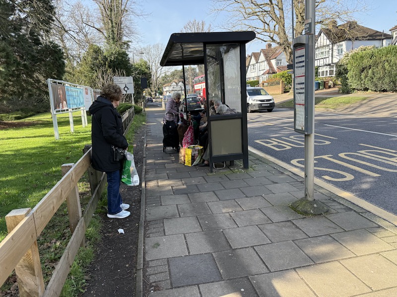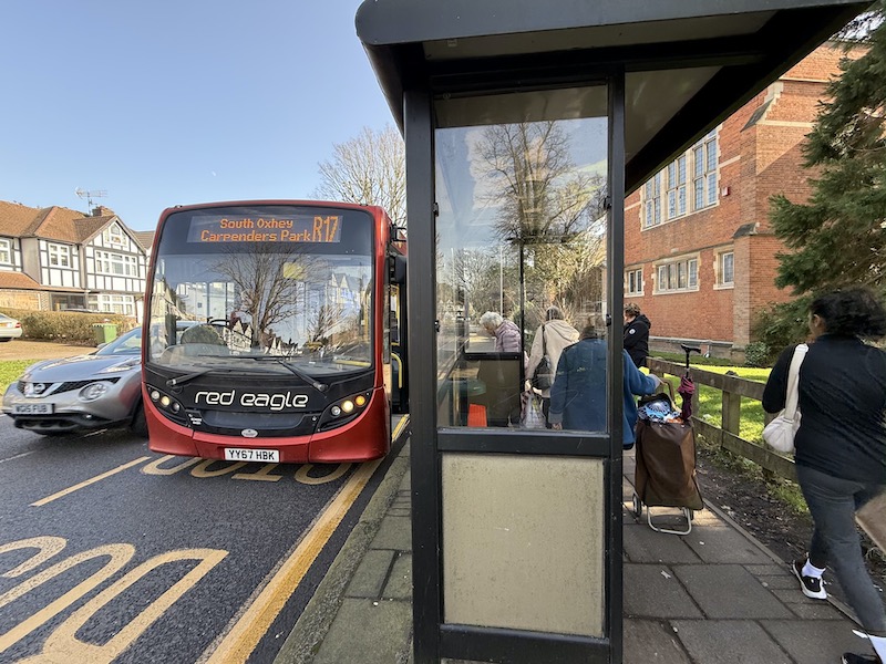 I’d been a bit uncertain whether the return journey to Carpenders Park would depart in this westbound direction (as the bus needed to head eastwards towards Oxhey Lane) so was reassured to see a small gaggle of passengers waiting in the bus shelter.
