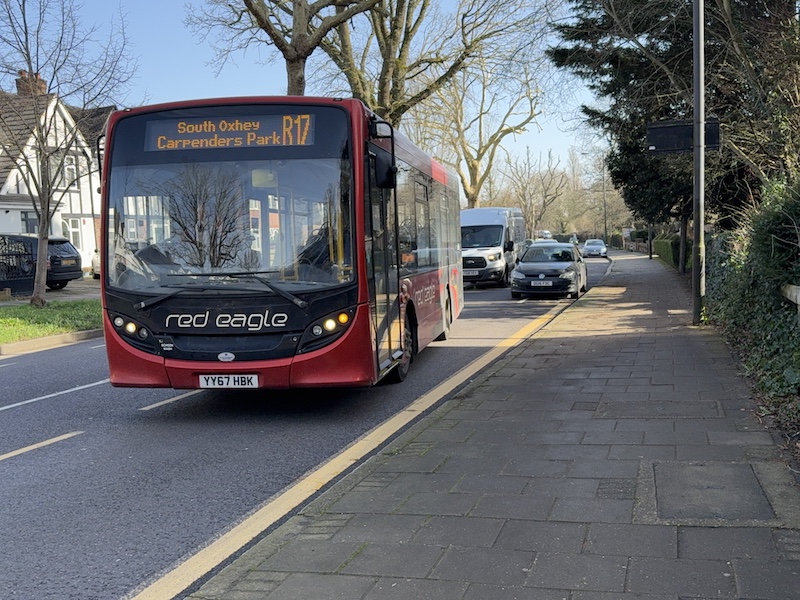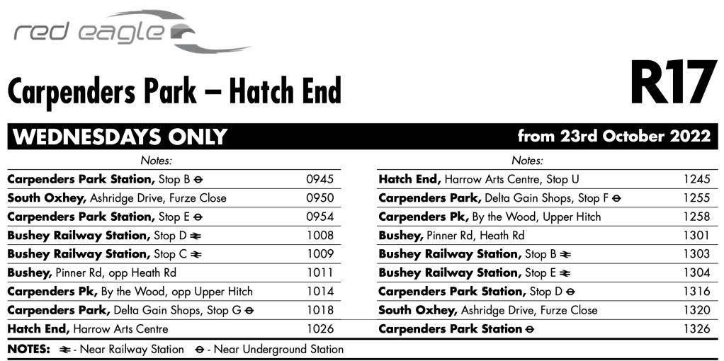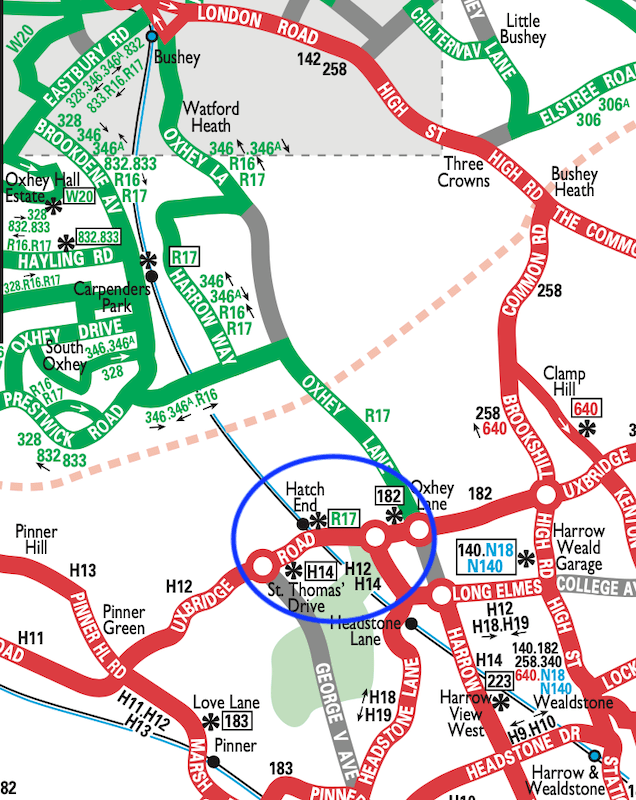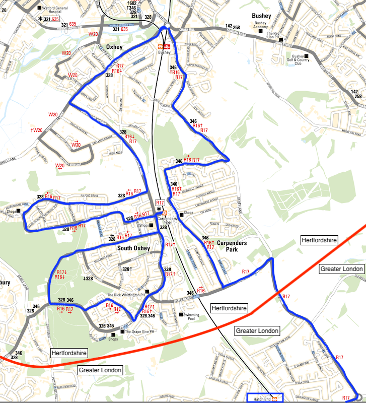 It’s the once a week, one return journey, route R17 that runs between Carpenders Park and Hatch End. And OK, I accept most of the route is in neighbouring Hertfordshire, but the southern terminus alongside Harrow Arts Centre in Hatch End is very much in Greater London and the route appears on TfL bus stops so I reckon it can be classified as a bus route in London. And it certainly qualifies as a ‘click bait’ blog headline.