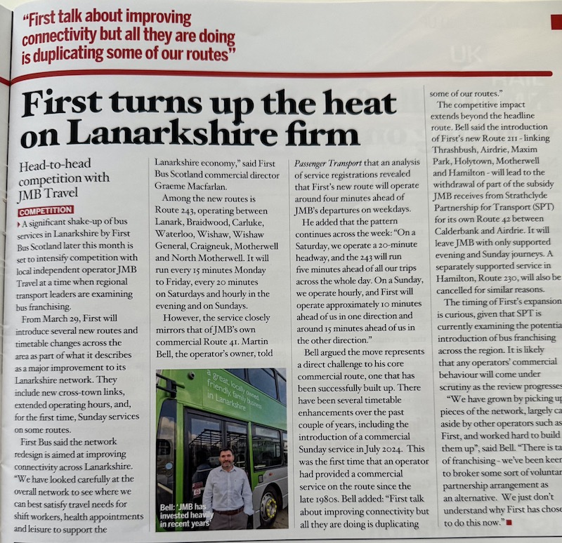 It’s true this 243/41 skirmish is just one small part of a much larger review of First’s Lanarkshire network which includes new links and improved frequencies but it’s being disingenuous and taking us for fools by not admitting there’s only one justification for new route 243 and that’s to damage JMB Travel’s market share.
