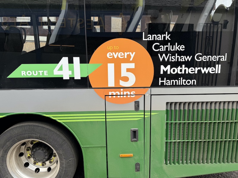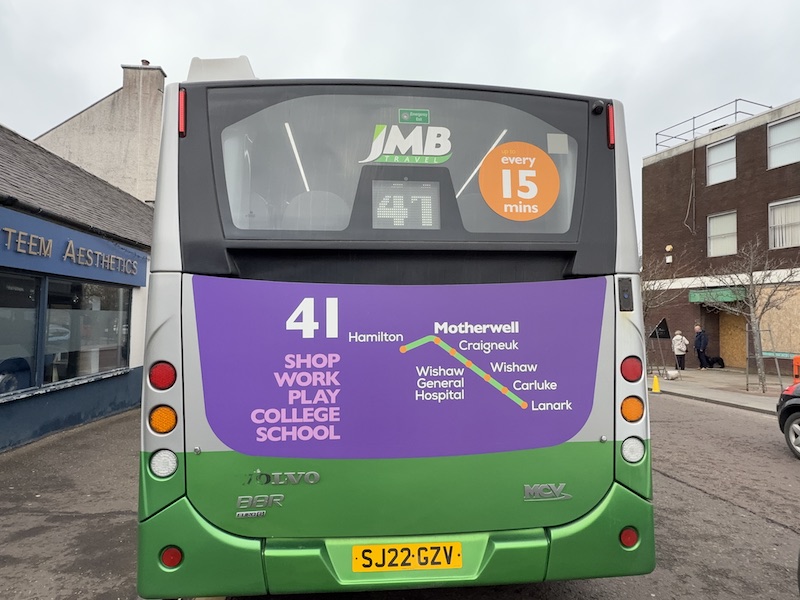 JMB has been running its route 41 every 15 minutes (Mondays to Fridays, 20 on Saturdays and hourly on Sundays) for many years. It’s a good route linking the communities of Lanark, Carluke, Bogside, Wishaw, Craigneuk and Motherwell after which buses continue to Hamilton.