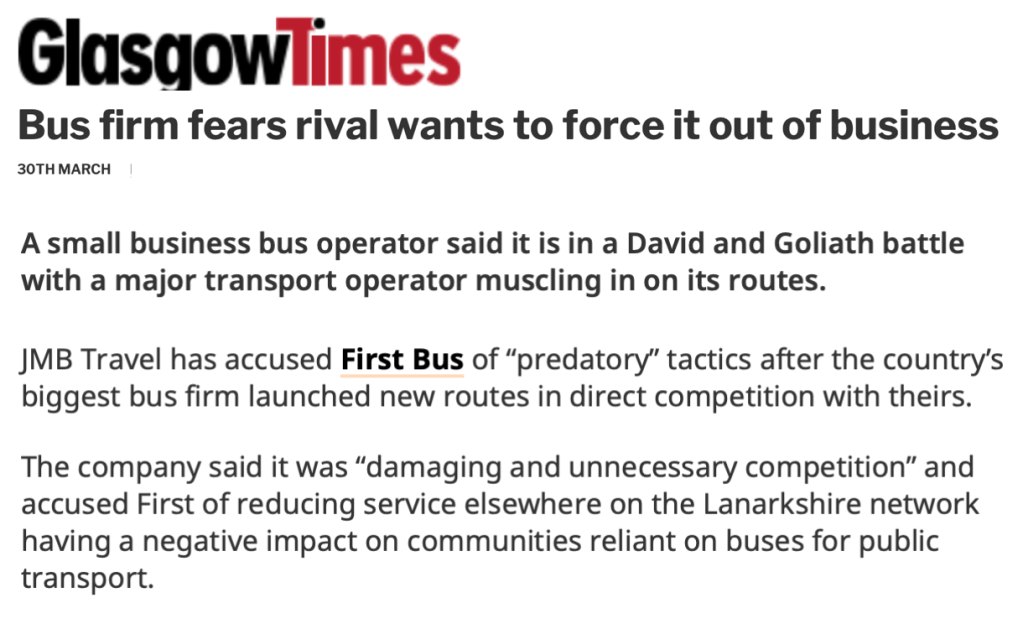 As in Guildford, this latest bus battle, which began on Sunday, was initiated by the Goliath of the pair, First Bus, aggressively duplicating JMB Travel’s, flagship bus route between Motherwell and Lanark.