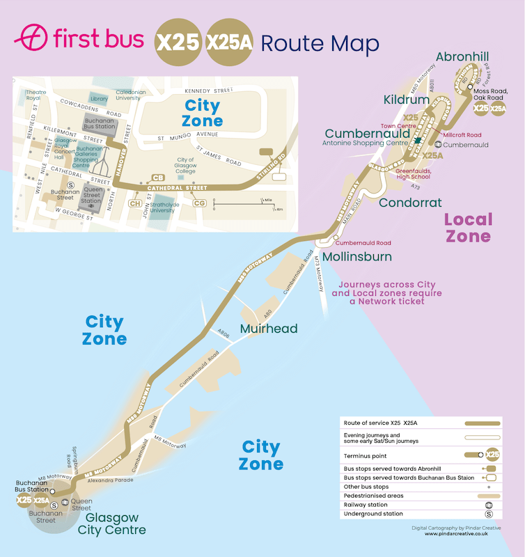 Buses run fast on the motorway between Glasgow and Cumbernauld then serving the town centre before continuing to the suburb of Abronhill.