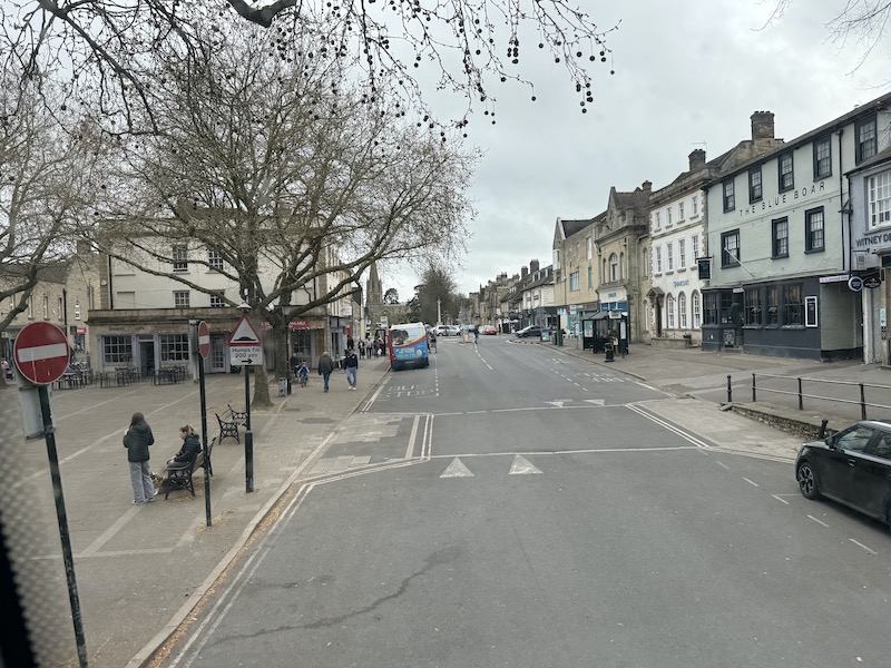 Thanks to a smooth run into Witney after that we reached the town’s Market Square at 11:34, six minutes late, and where two alighted and five boarded – with another two having alighted at the first stop in Witney where another had boarded.