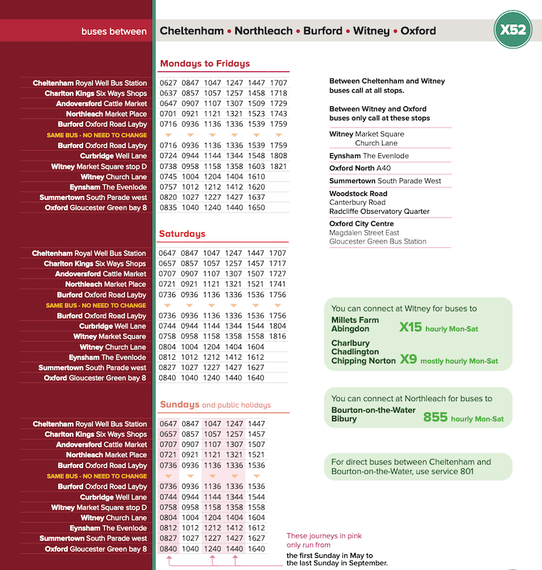 I suspect a lot of passengers waiting for Stagecoach’s frequent Oxford Tube avails themselves of Oxford Bus’s very pleasant facilities, as indeed did I, while keeping an eye out for the X52’s arrival from its first journey from Cheltenham and while doing so picked up a copy of the very attractive promotional brochure for the route on display in the leaflet rack.