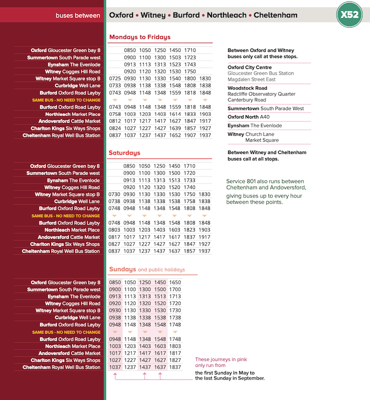 As ever I would like to see later departure from Oxford, though once one gets past Burford I doubt there are many commuters to work in Oxford, but both an 1910 after shops close and 2210 after the theatres could be useful. Cheltenham I know less about but again something later at 1817 to Witney might be covered by other services, indeed the 1707 choice of time seems a little odd and a bit rushed for costwold commuters to leave the town. Likewise for Saturday but if a stand alone route it is difficult to balance a departure from one end , or even the middle, with suitable arrival and return times.