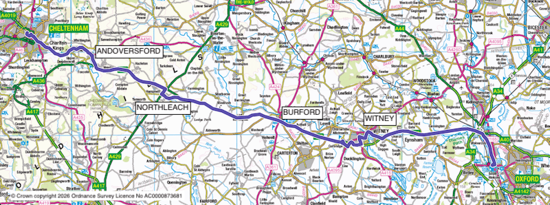 One more short deviation off the A40 sees us serve the village of Andoversford, where one alights, and then it’s back on the A40 with Cheltenham beckoning ahead.