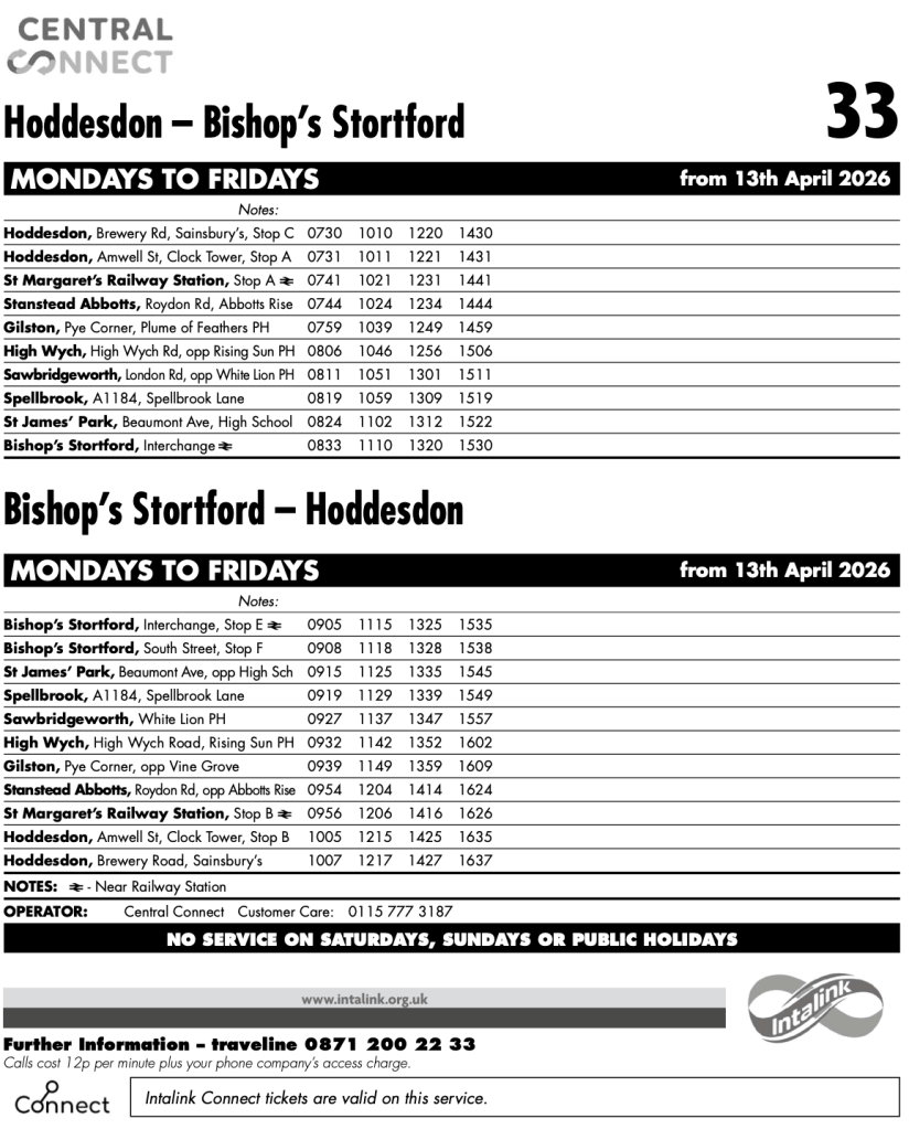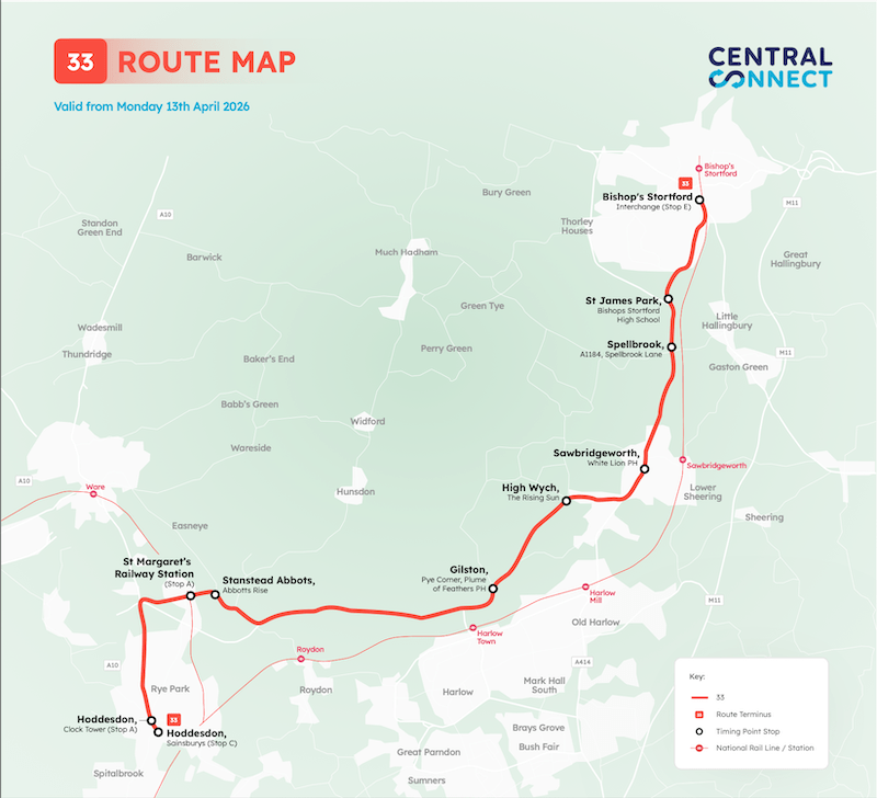 First up is route 33 in Hertfordshire providing a new four-return-journeys a day link between Hoddesdon and Bishops Stortford.