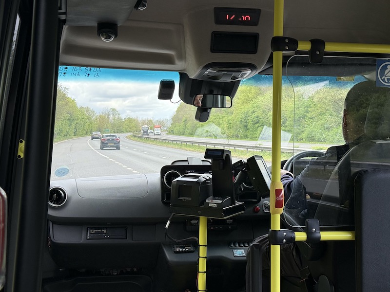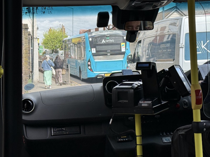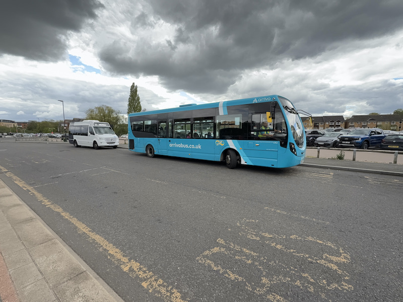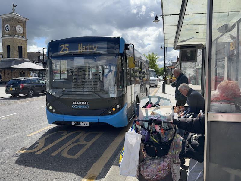 Unsurprisingly no-one travelled on the journey I made (at 12:20) between Hoddesdon and Bishops Stortford and although the incoming journey to Hoddesdon dropped a passenger off at the Clock Tower, Simon, the driver, told me she’d just boarded at the previous stop served by Arriva’s frequent route 310 making for an otherwise empty journey.