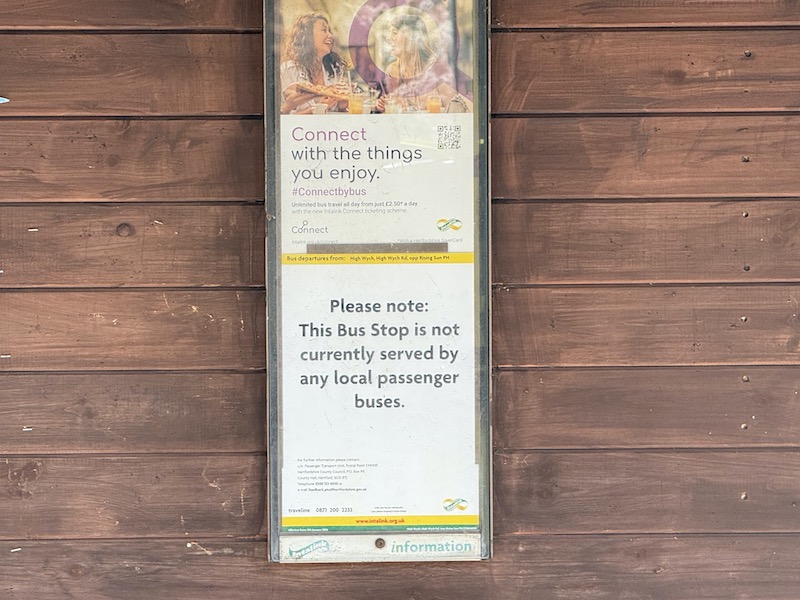 I sampled the route on Monday and sadly no timetable information was on display along the route. Worse than that, in the two villages which have regained a bus service – Gilston and High Wych – the bus stops still had notices on display advising passengers “this Bus Stop is currently not served by any local passenger buses”.