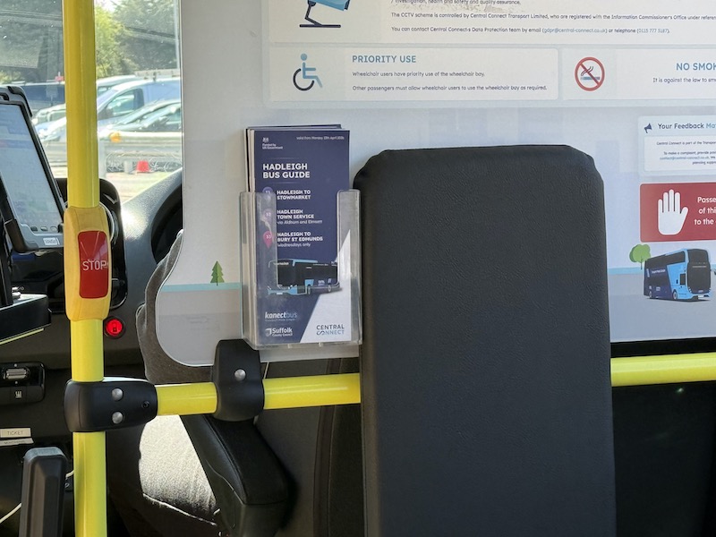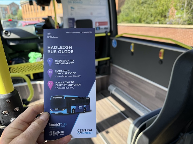 More positively, Central Connect (Konectbus) has produced a Hadleigh Bus Guide, with copies available on the bus, containing timetables, fare and route information for both the 51 and 52 and also its route 53/53A which provides a Wednesday only shopping journey to Bury St Edmunds.