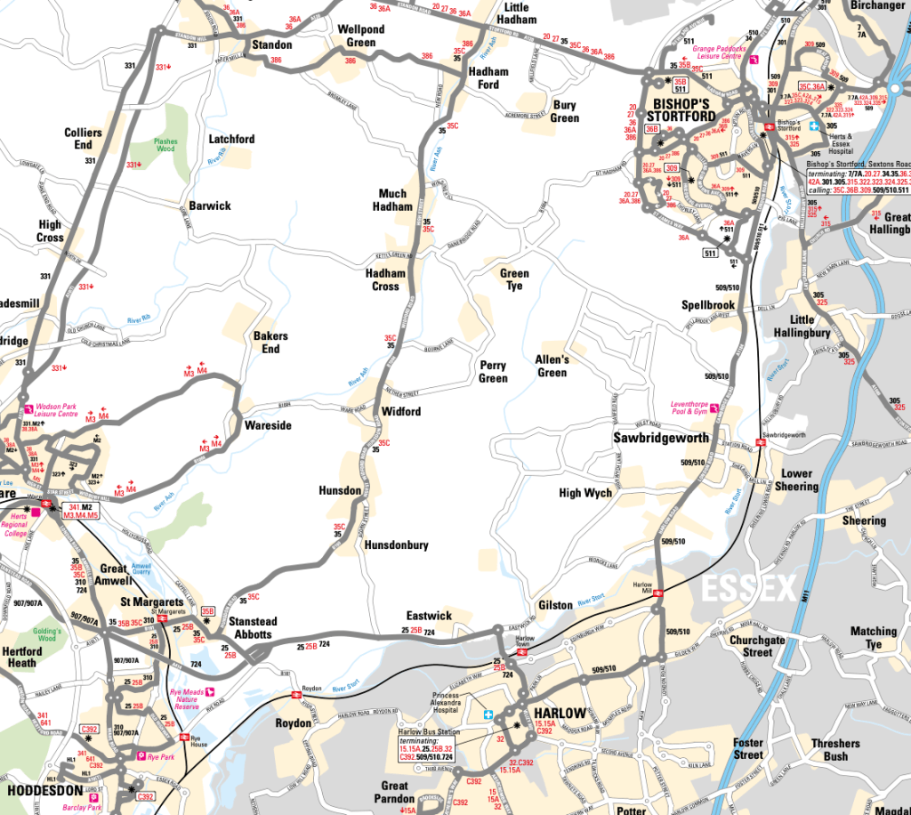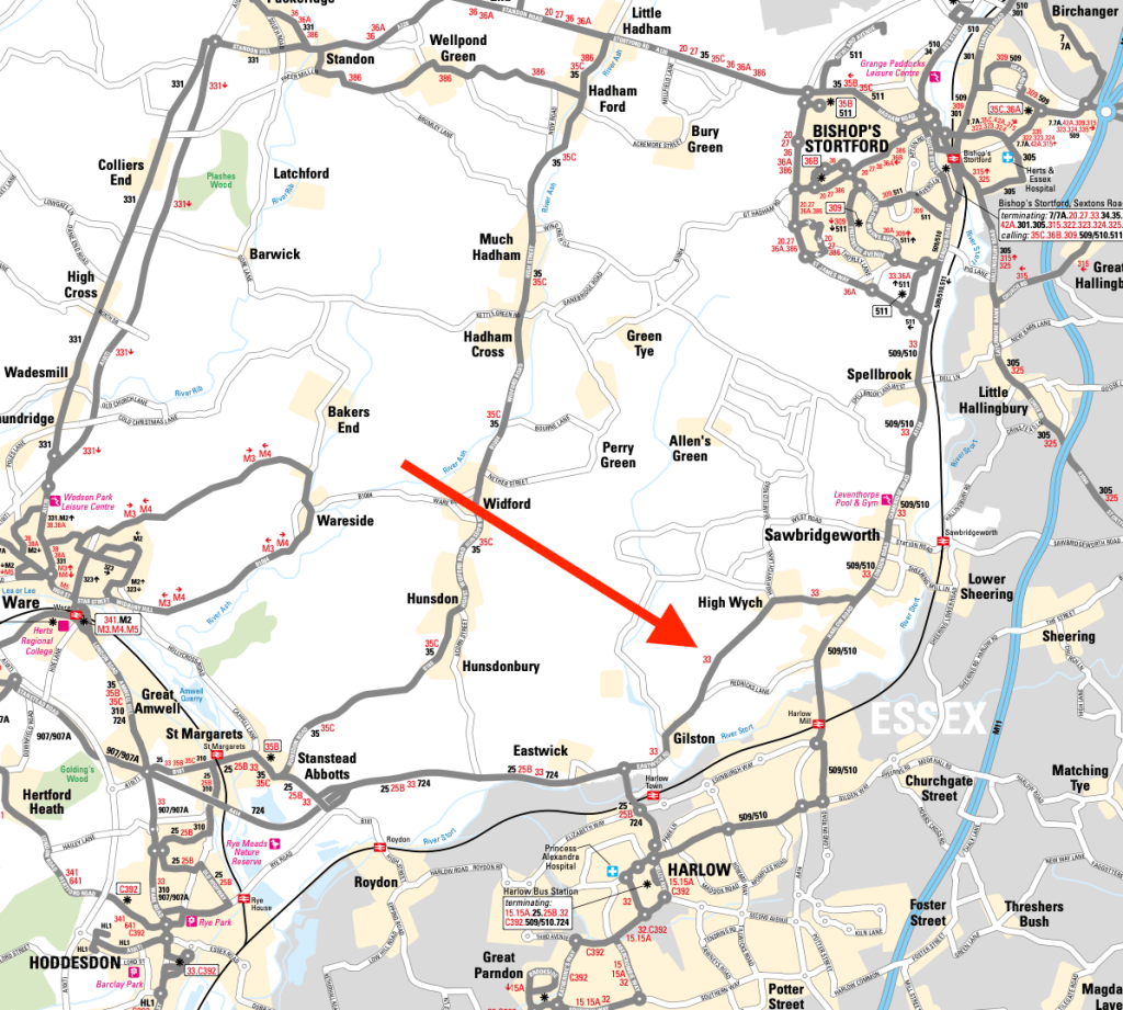 Admittedly the other journeys are not timed in the same way in that the frequency of the 33 is every 70 minutes but it does bring home the only new markets being served by this new route are to those two villages or for anyone wanting to travel between Hoddesdon and Bishops Stortford.