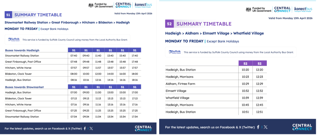 This is very commendable but it’s a shame it doesn’t include other bus routes in Hadleigh to make it more useful for passengers especially as I’m sure they’re probably all funded by the County Council including another operated by Konectbus – the hourly route 50 to Sudbury.