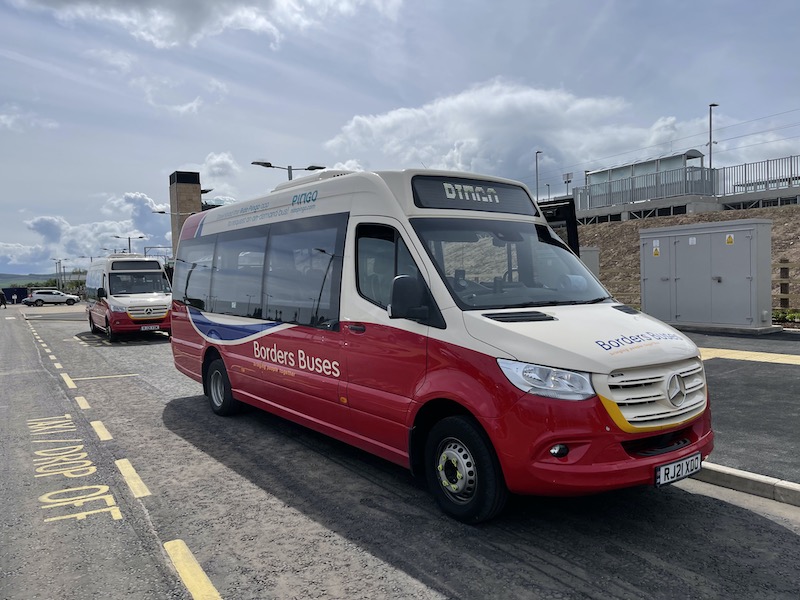May 2022: Borders Buses began operating Pingo – a two vehicle scheme (and a third when needed) with 16 seat Mercedes Sprinter minibuses which can also carry bicycles in rural Berwickshire. It ended two years later in May 2024 being replaced with a Taxi-Bus operated by a local taxi company taking bookings only by phone rather than an app.