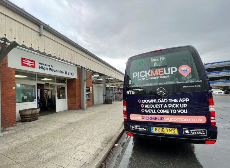 September 2022: PickMeUp is back but this time in High Wycombe as the Buckinghamshire Council funded scheme with a DfT Rural Mobility Fund grant of £736,000 begins a three year trial. Up to seven minibuses formerly used in the abandoned Oxford scheme of the same name were initially operated by Go-Ahead owned Carousel Buses but in June 2023 the operating area was extended and a fleet of eight new Mercedes Sprinter minibuses introduced.